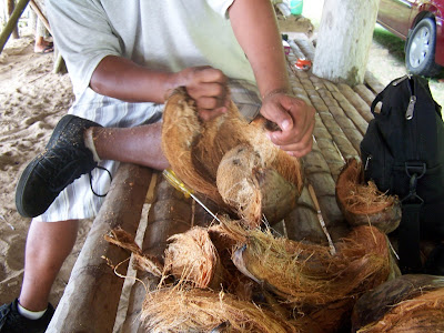 I (along with Winona as sous-chef) have a continual supply of Sushi rice, sushi vinegar, wasabi and Nori, crab and tuna on hand for serving up Sushi in a flash. We make our own pickled ginger, and are two of the few on the Island that can use chopsticks. I've adapted a few recipes from a cooking class I took a couple of years ago, including Salad Wraps (which are tricky with the short supply of fresh veggies here!) with homemade Thai peanut sauce. I've made the usual Stir Fry but have learned to make Lemon Chicken and the best Coconut Shrimp I've ever eaten... (using my own fresh grated coconut). Oh, and coconuts are lying on the ground everywhere, so when you want one, you just pick one up, shake it to make sure it still has juice in it, and use a machete to remove the husk (or in our case we use a friend with a machete to remove the husk!).. Because coconut is free, I try to use it in a lot of recipes. I've tried coconut syrup on French Toast and coconut. I was using coconut milk smoothies, Virgin Chi-Chi's and coconut, banana and chocolate milkshakes on a regular basis (until the blender broke...) Out of desperation when we had nothing but onions in our house I made French Onion soup from scratch... it was phenomenal - as good as any we've had even at the Keg... so we have that every few days as well.